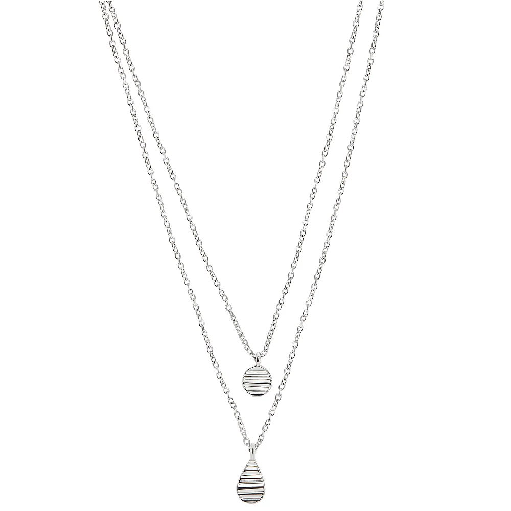 You’ll love the way this Sonoma Goods For Life® 2 Row Rhod Textured Coin & Teardrop Pendants Necklace looks around your neck.